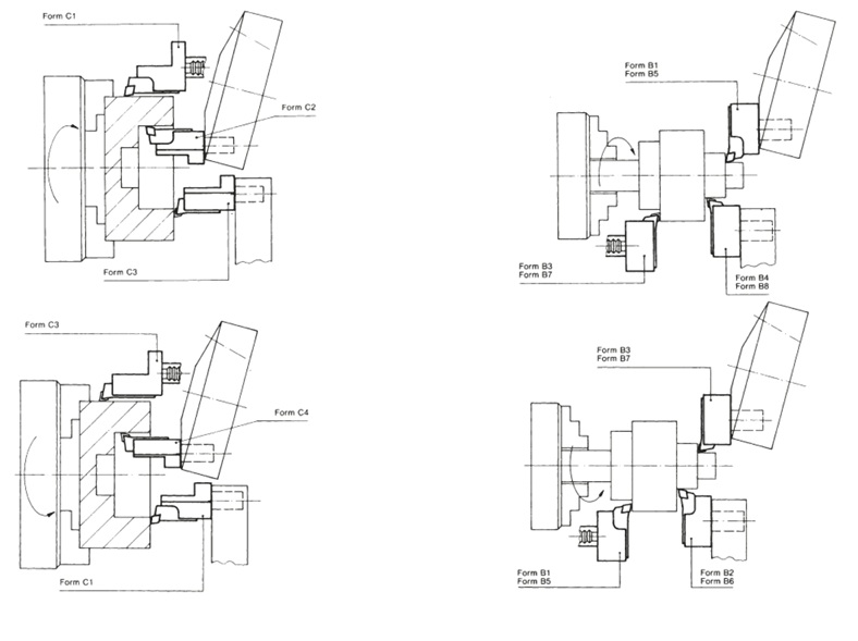 Příklad použití radiálních a axiálních držáků VDI pro vřetena s pravým a levých chodem na str.162 (na obr aplikace.: axiální držák s levým chodem, radiální držák s levým chodem, axiální držák s pravým chodem, radiální držák s pravým chodem)