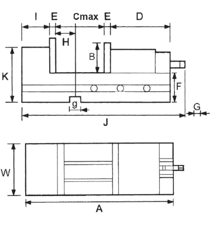 | A | B | Cmax | D | E | F | g | G | H | I | J | K | kg | material | Material | Max.up.síla daN | Tolerance výšky | Tvrdost HRC | Typ | W |